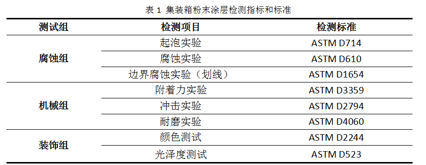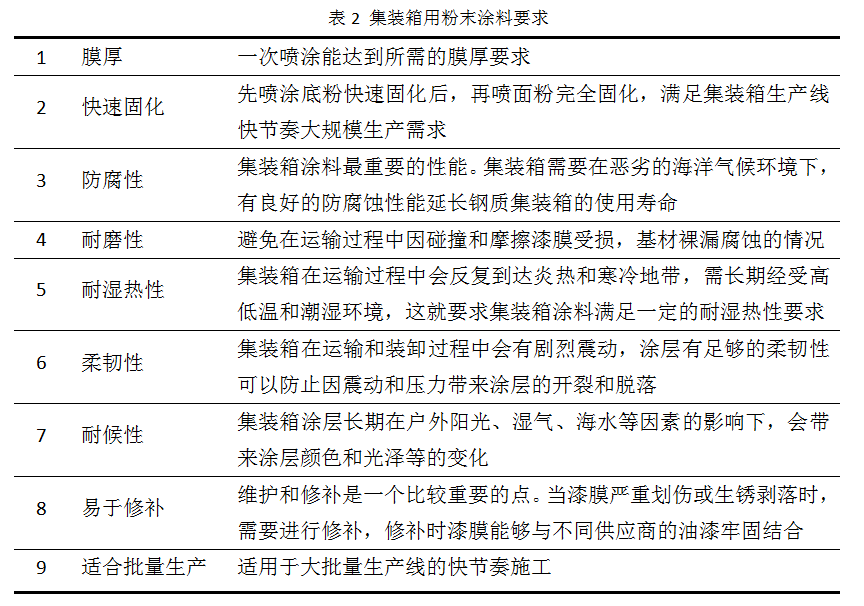 集装箱的运输通过陆运和海运,往返于世界各地,在运输途中会遇到强烈阳光、高低温、海水、潮湿等复杂气候环境,这就需要涂层能发挥很好的防护作用,保护基材不受损坏,延长箱体使用寿命,故集装箱涂料要求有较强的抗腐蚀性和耐高低温变性(一般为-40-70℃),同时还要求抗紫外线好、不变色,不粉化、耐磨损、抗冲击、装饰性好等特点[2],因此集装箱粉末涂料特性必须符合表2要求。