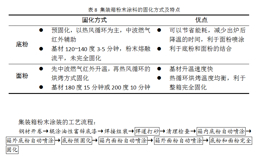 集装箱粉末喷涂工艺采用两涂两烤,底漆为纯环氧型粉末涂料,面漆为纯聚酯型粉末涂料。先将箱内箱外喷涂底粉,低温下预固化后,待箱体降温到50℃左右,再喷涂面粉,表8为具体的固化方式和固化特点。