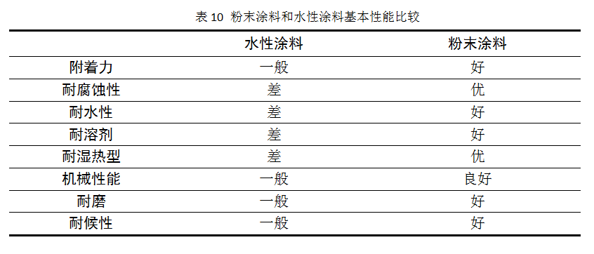 相比水性涂料,粉末涂料的性能优势明显,主要体在耐水、耐溶剂、耐磨、耐候等性能方面。热固性粉末涂料是在高温条件下发生交联反应,形成致密的网状涂膜,涂层的综合性能非常好;而水性涂料是用水作溶剂或分散介质的涂料,其耐水性和耐溶剂性能差,而且由于水的表面张力较大,涂料对基材的润湿困难,容易出现很多缺陷[4]。表10为粉末涂料和水性涂料整体上性能耐受方面的比较。