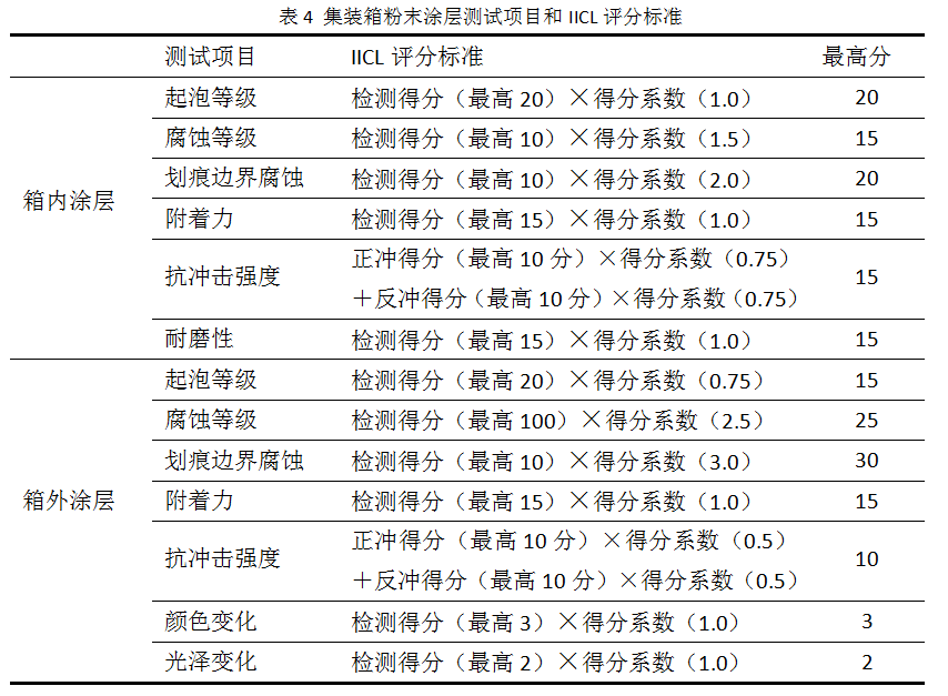 IICL的测试标准更注重于模拟自然环境对涂膜的损害,其设定的循环腐蚀试验方法得到了行业内的认可。由于涂层的评分标准:100分满分,70分合格,为了避免某种涂料将一项或几项性能设计的极为突出,得到很高的分数,而其他项性能很差,也能通过KTA实验室测试的现象,为此,IICL将每个测试组设定了最低分数线[3]。箱内涂层,腐蚀组要求最低得分40分,机械组要求最低得分30分;箱外涂层,腐蚀组要求最低得分55分,机械组要求最低得分15分,该设定能有效改进分数评判中的缺陷,注重涂层的综合性能。