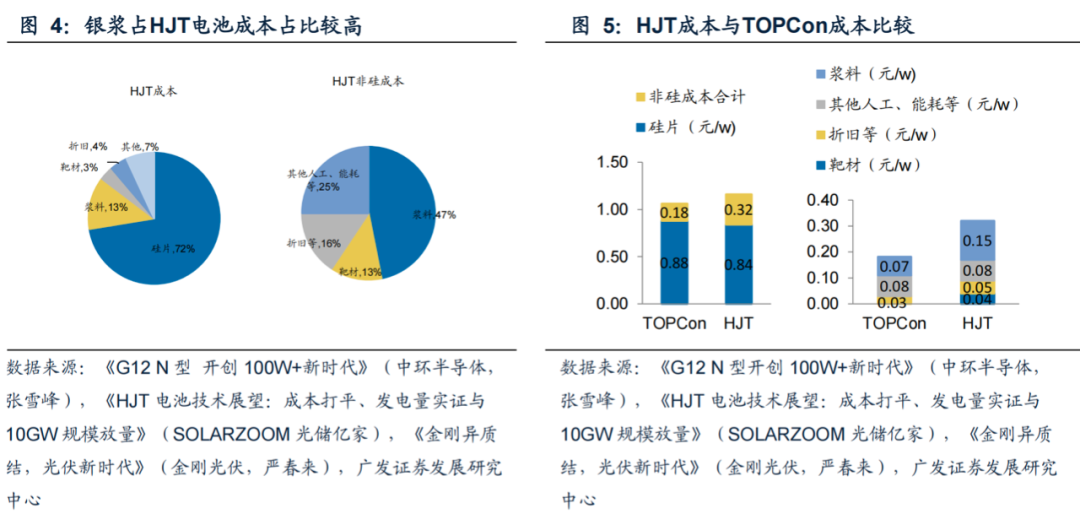 降低银耗是HJT降本的重要手段。HJT电池单瓦成本比TOPCon高约一毛钱,其中单单银浆部分,HJT电池的单瓦成本就比TOPCon电池高了8分。银浆占HJT电池成本20%左右,非硅成本的40%左右。银浆是HJT电池降本空间最大,最关键的部分。