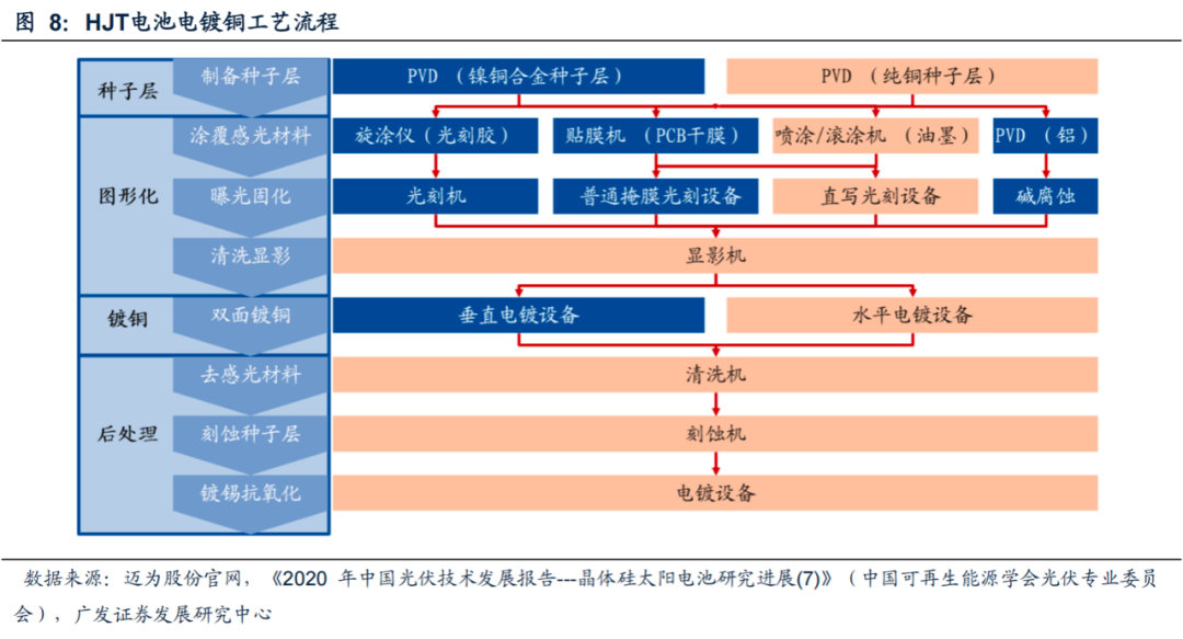 HJT电镀铜工艺包括四个大环节:(1)种子层沉积;(2)图形化;(3)电镀;(4)后处理。各环节内部有不同的技术路线竞争。