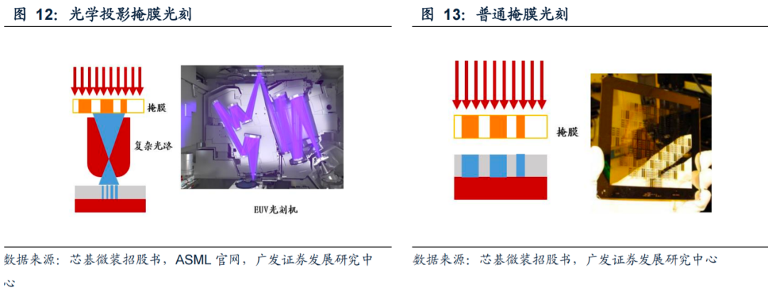 ①光学投影掩膜光刻。核心指标最小线宽、对位精度、产能等性能优异,半导体领域广泛应用。采用光刻机设备,使得特定波长的光通过复杂光路,把掩膜上的图案缩小展示,照射到光刻胶上,完成曝光。光学投影掩膜光刻精度非常高,但是成本极高,只适用于芯片等高端产品,用于光伏产业不具备量产经济性。