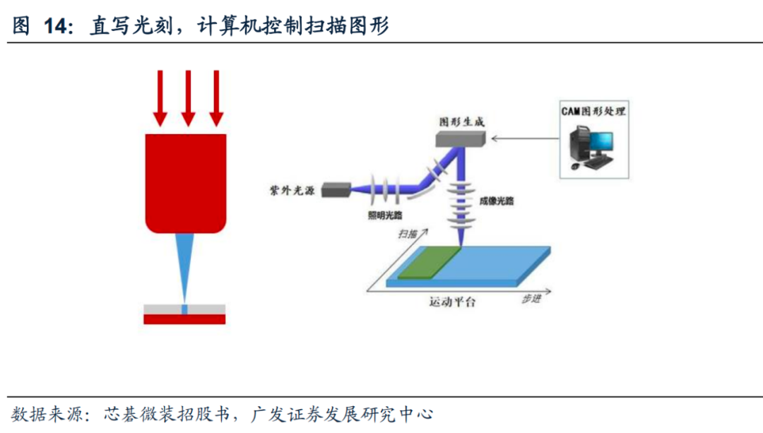 ③直写光刻技术相对主流。指计算机控制的高精度光束聚焦投影至涂覆有感光材料的基材表面上,无需掩膜直接进行扫描曝光。直写光刻最高精度5μm,满足铜电镀的精度要求。直写光刻成像不需要使用底片,可节约底片的物料成本和相关人力成本。国内厂商芯碁微装,捷德宝,太阳井等正在研发铜电镀用激光直写光刻(Laser Direct Imaging, LDI)设备。