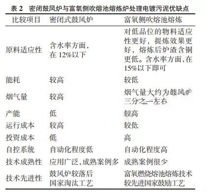 现从以下几点对比密闭鼓风炉与富氧侧吹熔池熔炼炉处理电镀污泥优缺点(表2)。