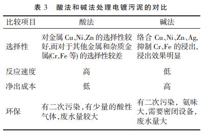 由于电镀污泥的含水率很高,可以利用电镀污泥中的水分充当溶解介质,所以湿法工艺在处理电镀污泥中有一定优势,主要有酸法和碱法,两者对比优缺点如表3。
