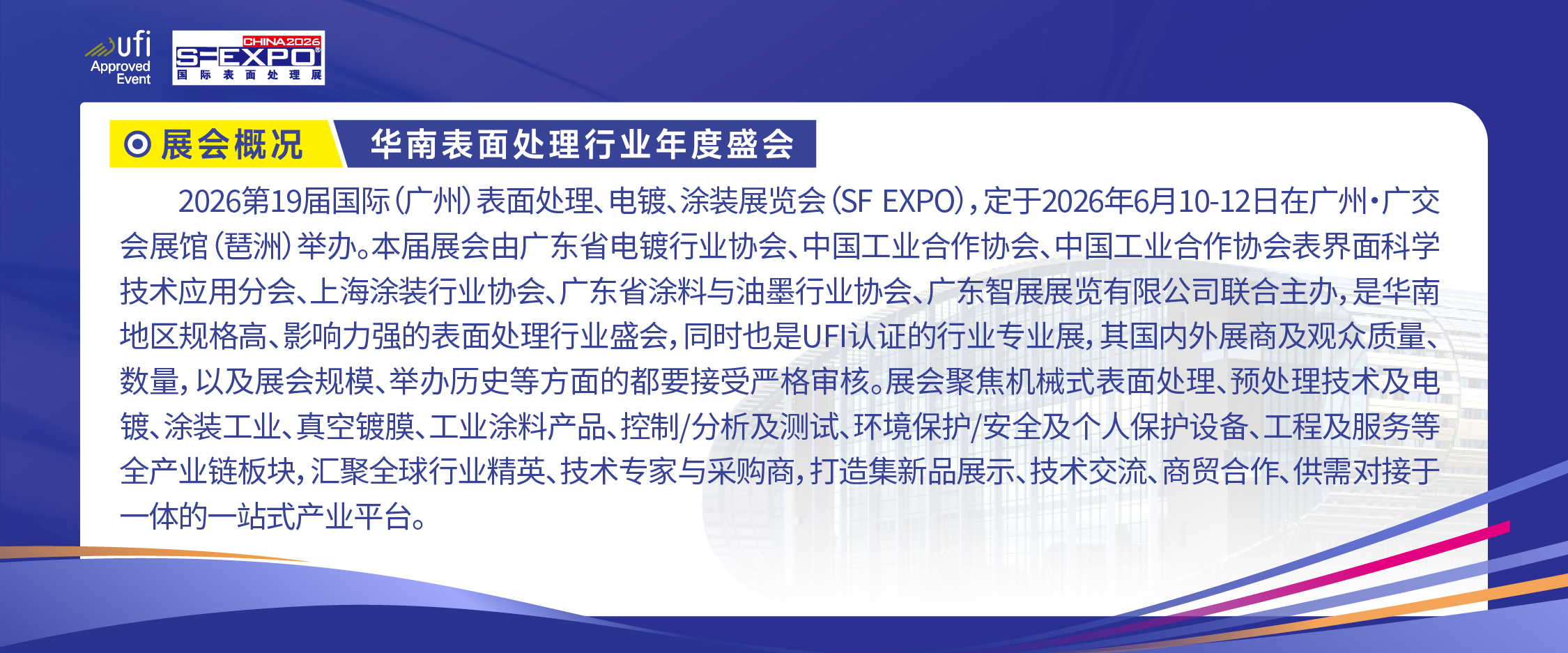 为推动广东省表面处理、电镀行业高质量发展,搭建高效商贸对接与技术交流平台,广东省电镀行业协会(以下简称协会)深度参与2026第19届国际(广州)表面处理 电镀 涂装展览会(以下简称SF EXPO)。协会以“集中参展+组团观展+同期活动”三措并举,携优质会员企业集中亮相,组织会员单位高效观展,充分发挥行业桥梁纽带作用。同时,也通过丰富的同期活动凝聚行业共识,彰显广东电镀产业的集群优势与创新活力。