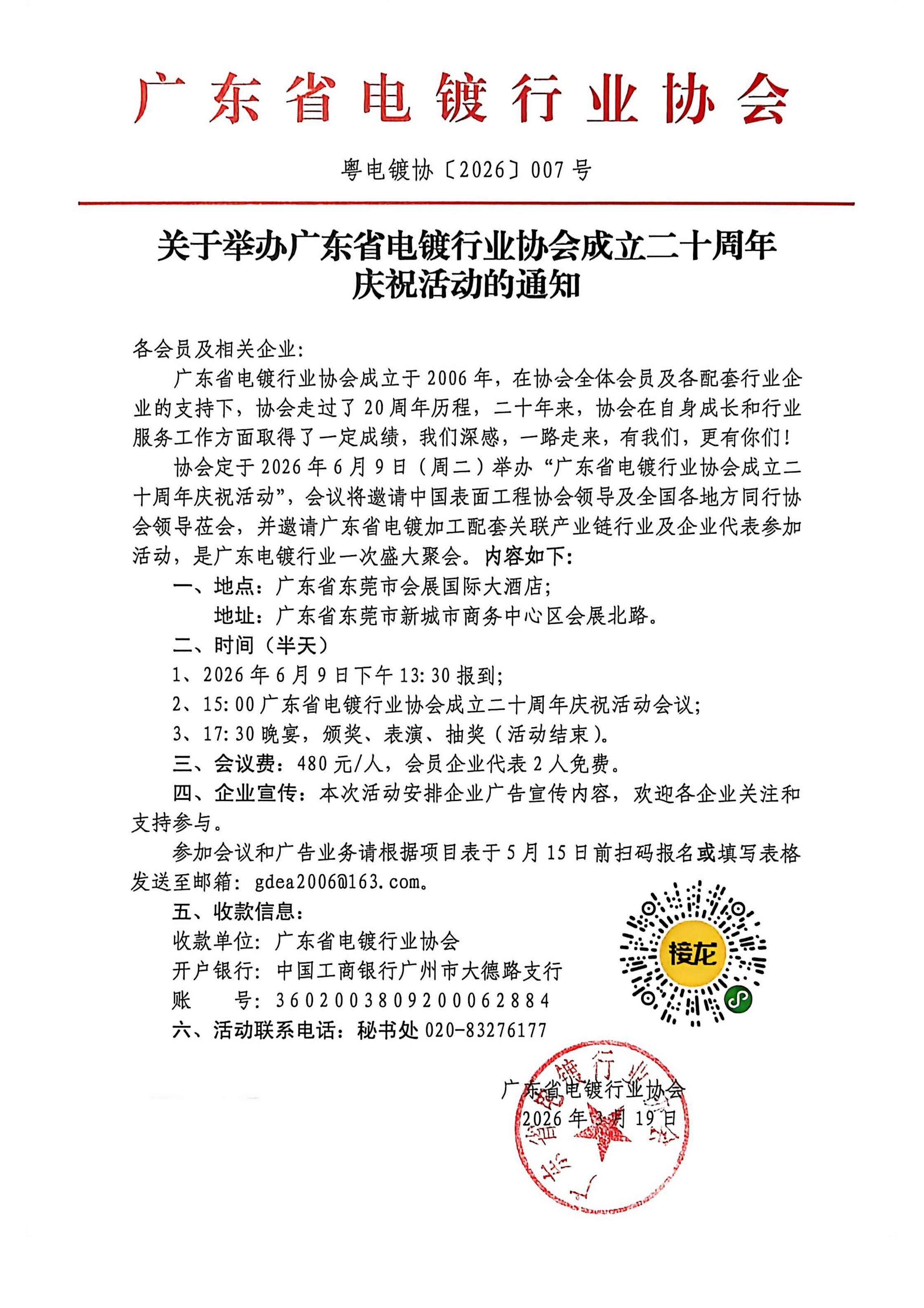 在同期活动筹备方面:协会策划并落实“广东省电镀行业协会成立二十周年庆祝活动”于6月9日举行,预计规模250人,活动通过庆典、交流晚宴等环节,回顾协会二十年历程、表彰先进、共话未来,凝聚行业合力,进一步整合行业资源,推动电镀行业上下游协同发展,助力行业向绿色化、智能化、高端化转型。