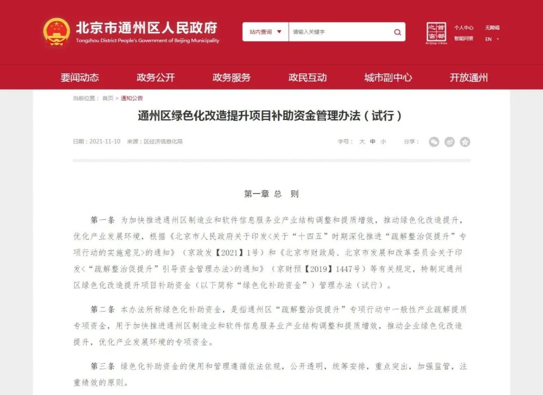 北京市通州区发布《通州区绿色化改造提升项目补助资金管理办法(试行)》。绿色化补助资金主要用于对企业参与绿色制造体系建设、绿色化改造项目、开展可再生能源替代项目、减碳发展等方面给予一定的补助支持。