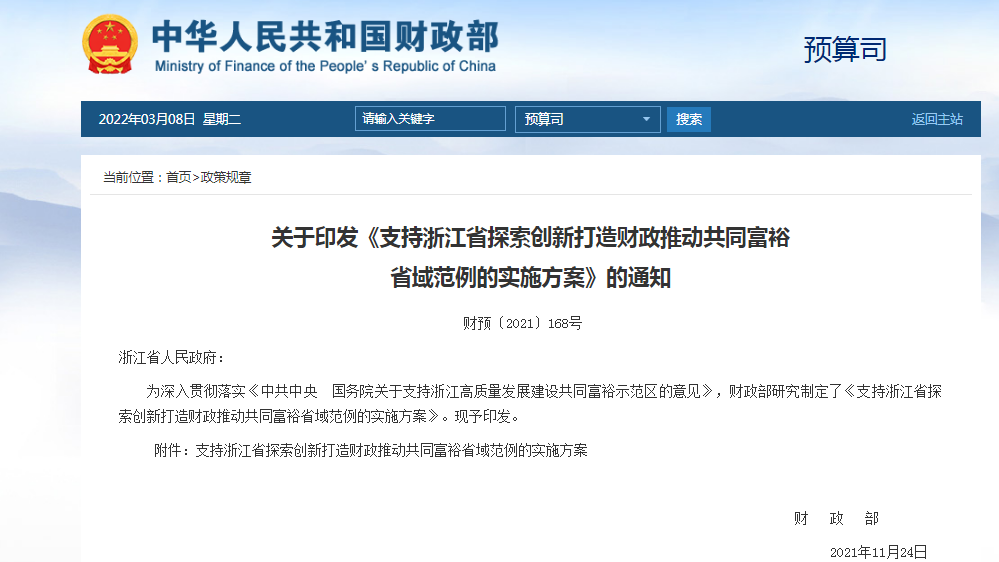 五、财政部印发《支持浙江省探索创新打造财政推动共同富裕省域范例的实施方案》。创新碳达峰、碳中和财政综合支持政策。