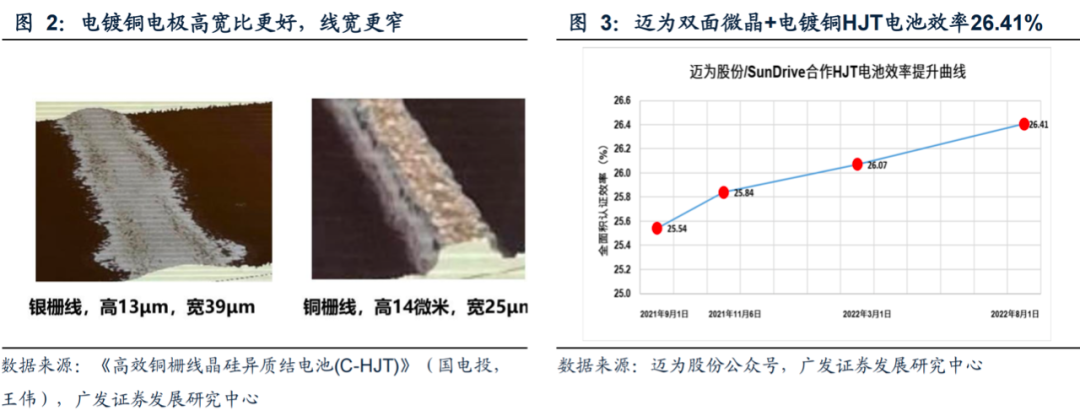 电镀铜不只是“降本”技术,更是“提效”技术。HJT电池由于膜层原因采用低温工艺,只能采用低温银浆,而低温银浆为纯银和有机物的混合物,导电性能较差,因此耗用银浆较多;银包铜浆料今年底明年初有望迈入量产,但是仍然无法彻底解决银耗问题;而电镀铜工艺制备的纯铜电极电阻显著小于含有机杂质的低温银浆,高宽比更大,遮光更少,线宽有望降至20μm以下,“去银化”的同时也可实现更高的转换效率,迈为股份联合SunDrive开发的应用了铜电镀的HJT电池效率达到了26.41%,比常规的HJT电池转换效率提高了1%以上。
