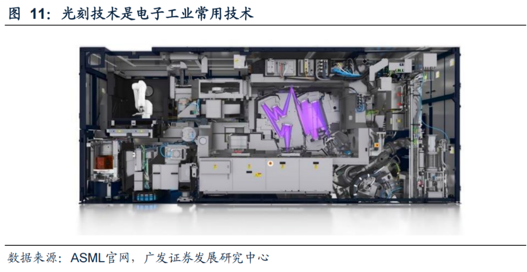 技术渊源为电子产业的光刻技术。选择性曝光感光材料被后,可以用显影液洗去被曝光的部分(正性光刻胶)或未曝光区域(反性光刻胶),从而将微图形结构转移到覆有感光材料的晶圆、玻璃基板、覆铜板等基材表面上的微纳制造技术。光刻技术加工制造的器件包括:芯片、显示面板、掩膜版、印制电路板PCB等。光刻技术的主要工艺流程包括预处理、涂胶、曝光、显影、刻蚀和去胶等一系列环节。