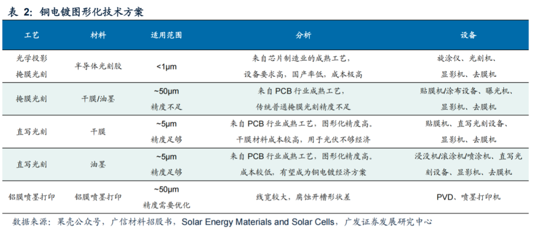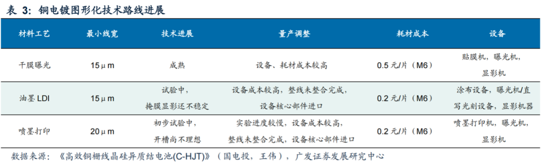 (2)光刻步骤。HJT铜电镀图形化环节有多种光刻方案选项:光学投影光刻、普通掩膜光刻、直写光刻、以及较为独特的喷墨蚀刻,此处各家分歧较大。