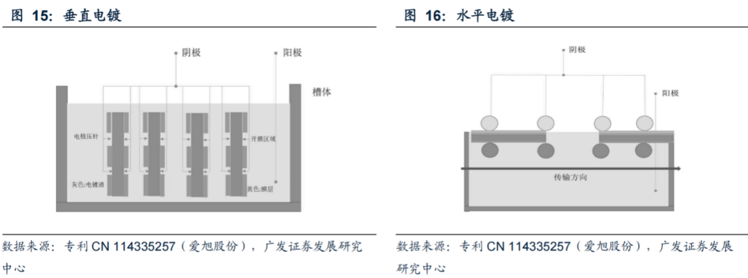垂直电镀应用较多。垂直电镀广泛应用于PCB电镀铜工艺,夹爪夹住阴电极,竖着挂在电镀槽中进行铜电镀。从产业目前进展看,垂直电镀用于HJT电池铜电极电镀,必须放慢沉积速度以提高均匀性,所以单机产能比较小(每小时2000-3000片),此外,垂直电镀良率也比较差,容易发生碎片。