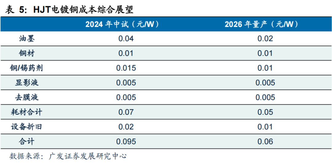 中试线有希望将电镀铜HJT电池成本降低至0.1元/W,未来有望降低至0.06元/W。耗材成本方面,感光材料,铜材,药剂最多。油墨国产化后,有望再降本0.02元/W,预计量产铜电镀整体耗材成本(0.05元/W)低于银包铜(0.07元/W),具备经济性。