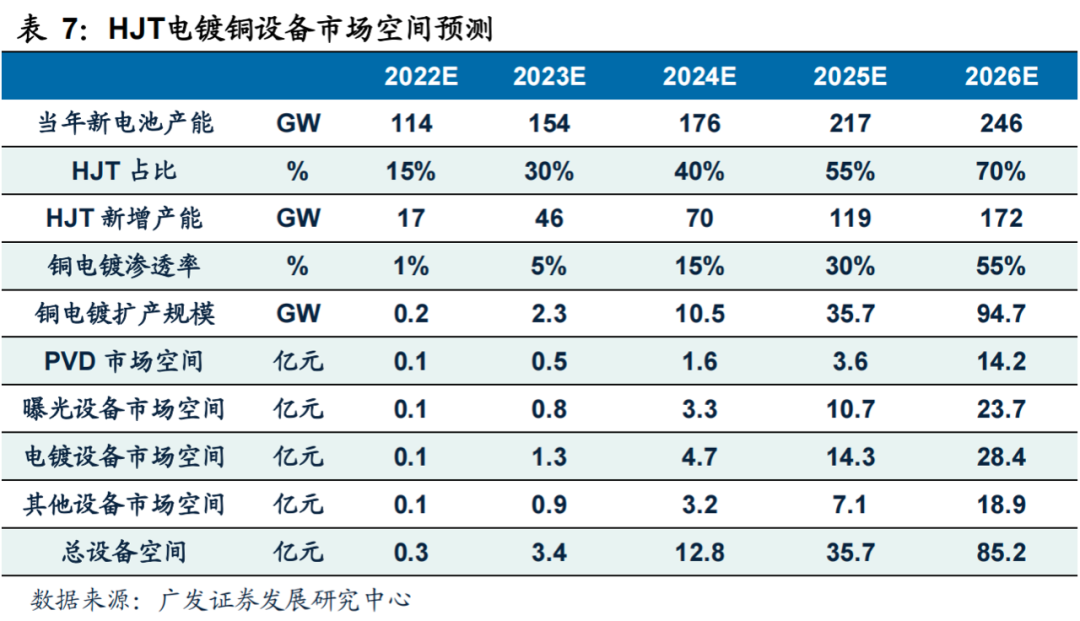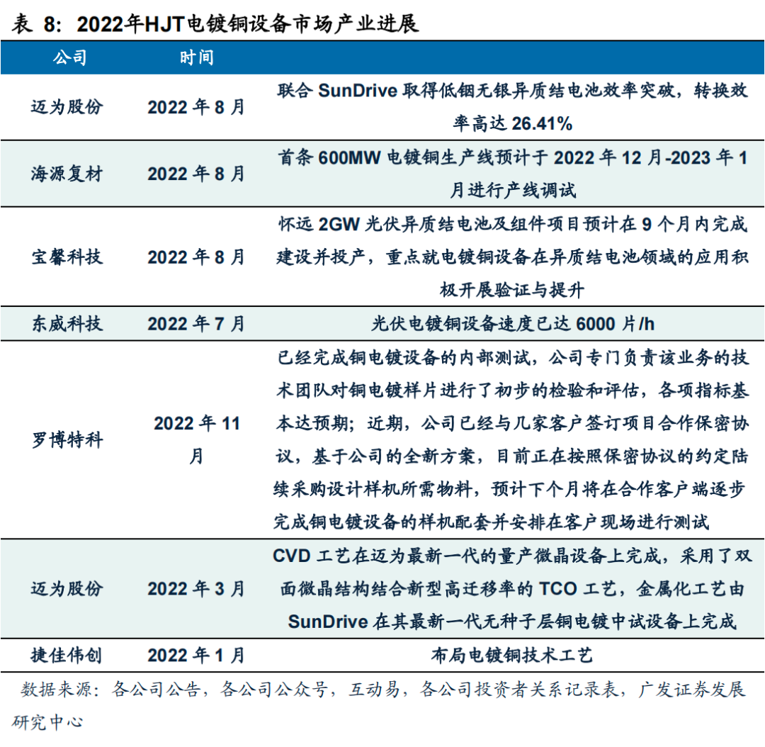 光伏电镀铜产业化加速。2022年8月,迈为联合SunDrive取得低铟无银异质结电池效率突破,转换效率高达25.94%;宝馨科技重点推进电镀铜设备在HJT领域的应用;海源复材首条电镀铜产线预计在2022年12月至2023年1月进行调试。2022年7月,东威科技光伏电镀铜设备速度已达6000片/h。此外,还有诸如捷得宝、太阳井等未上市的优秀公司正在积极探索电镀铜技术。
