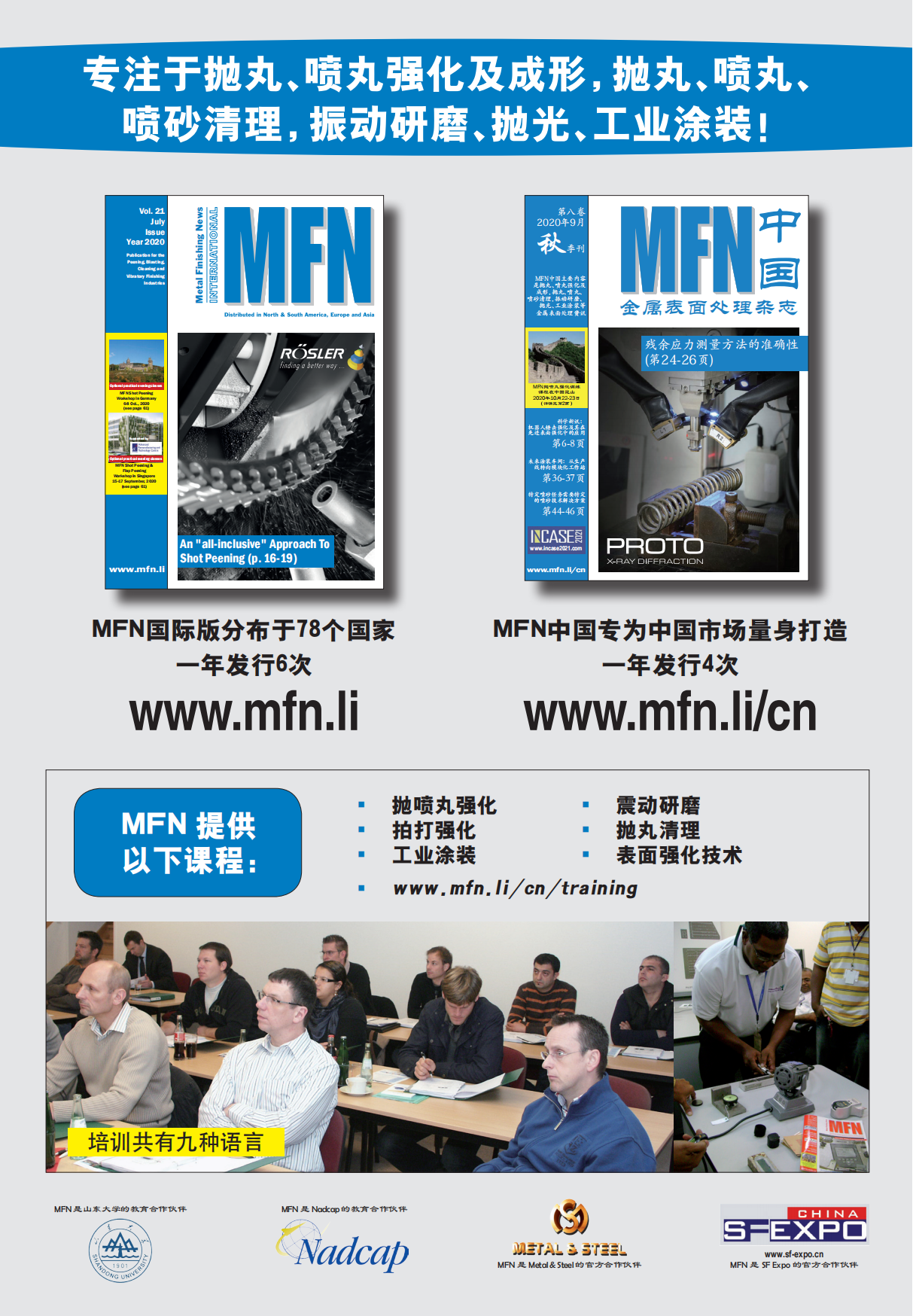 瑞士《金属表面处理杂志》(Metal Finishing News,简称MFN)是一本专注于抛丸、喷丸强化及成形,抛丸、喷丸、喷砂清理,振动研磨、抛光、工业涂装等领域的国际杂志。该杂志发行近78个国家,一年发行6次。MFN的教育部门教授不同的工艺或提供全球咨询服务,更多详细信息,请点击: https://china.mfn.li/